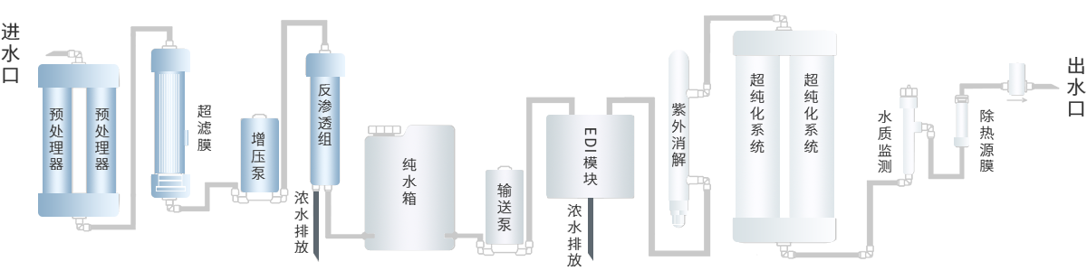 采用多級預處理器過濾,雙膜法及雙級反滲透工藝,進口陶氏反滲透膜片,配備EDI電除鹽膜塊,更深層次去除水中離子,